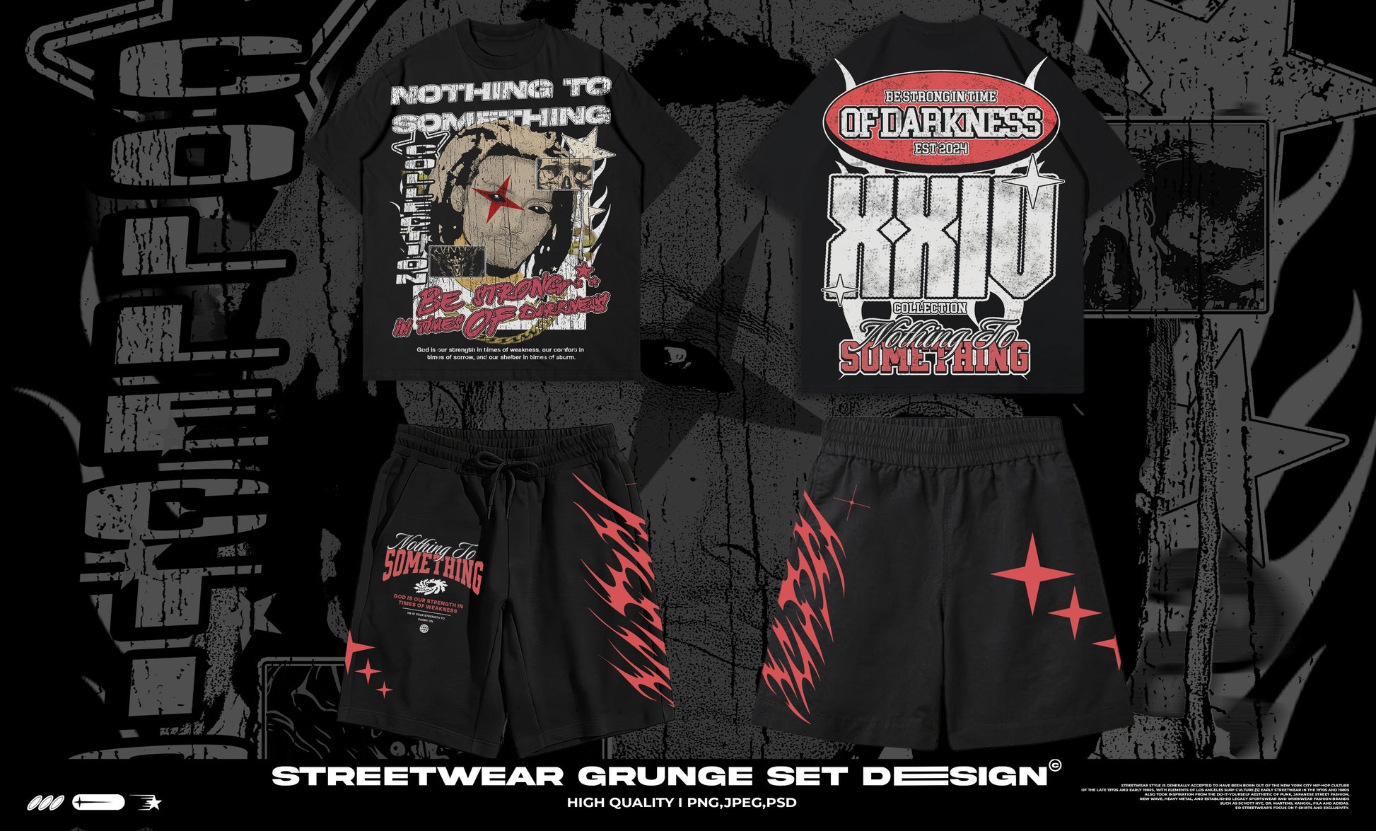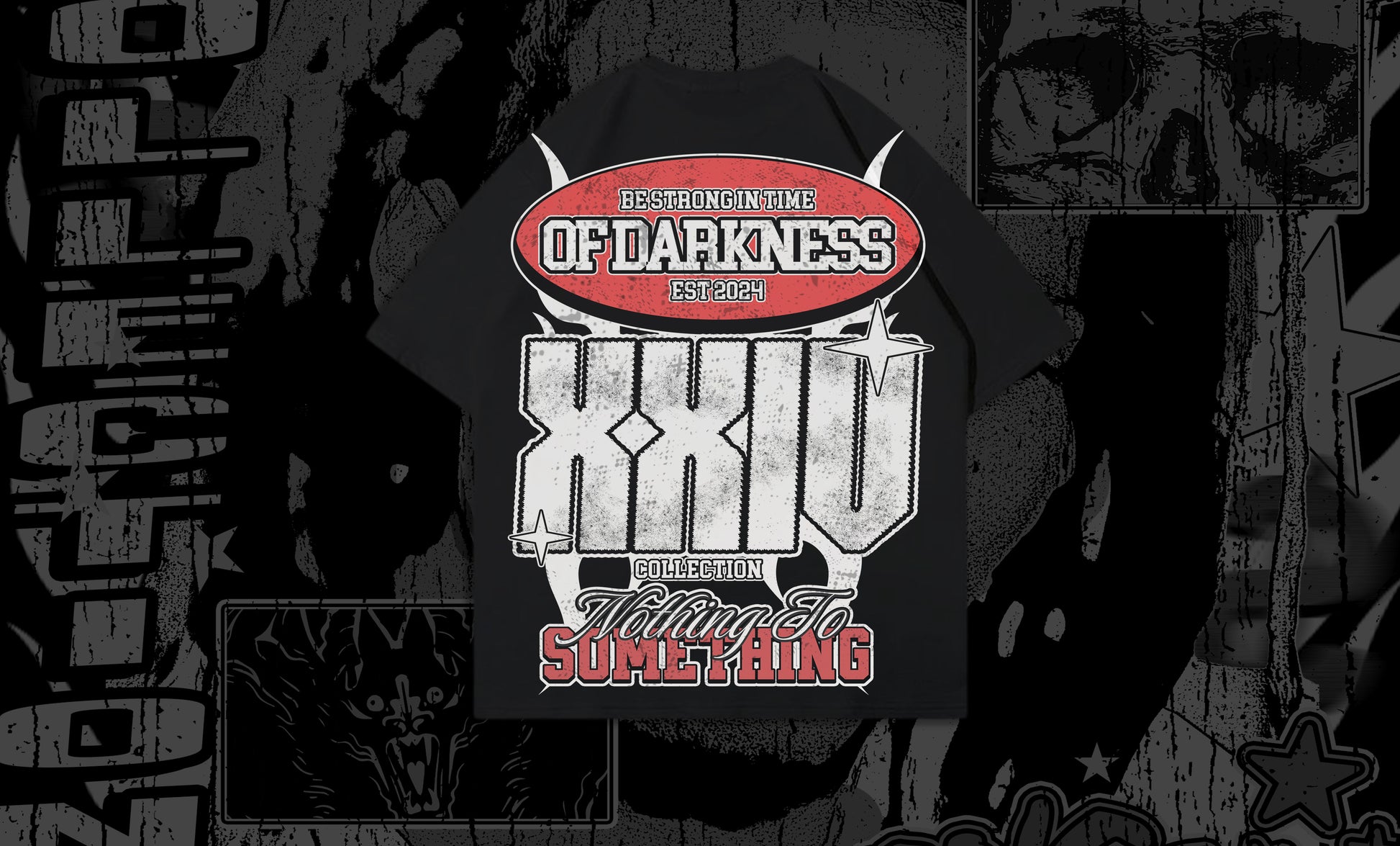 Gritty, motivational, NTS to the core. The front hits with a portrait collage, red star eye mark, and distressed NOTHIN TO SOMETHING typography stacked over “Be Strong in Times of Darkness.” The back carries the bold XXIV collection graphic with stars and an oval badge call-out—built for statement fits and stage lights.